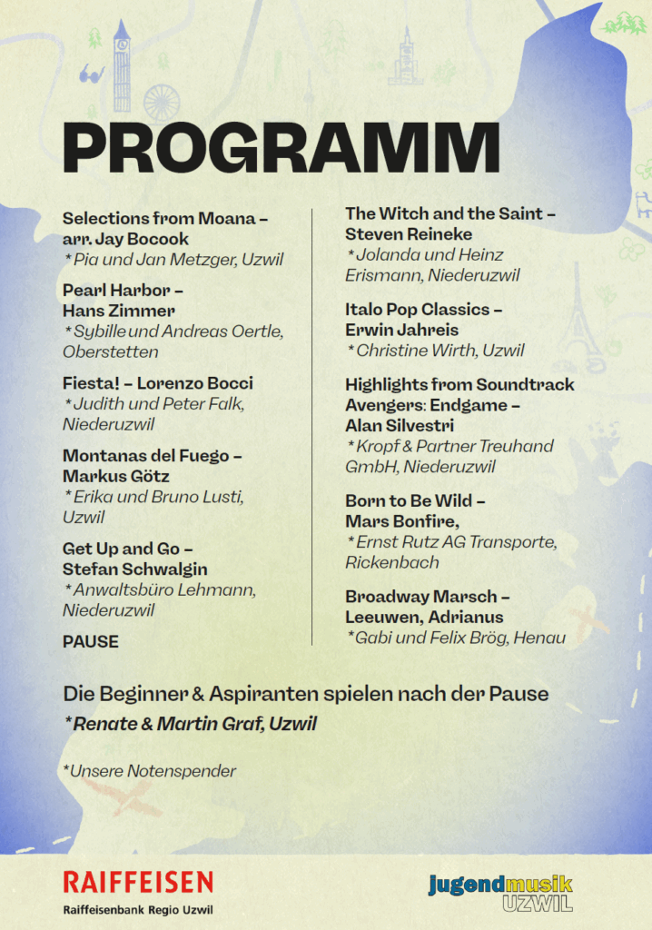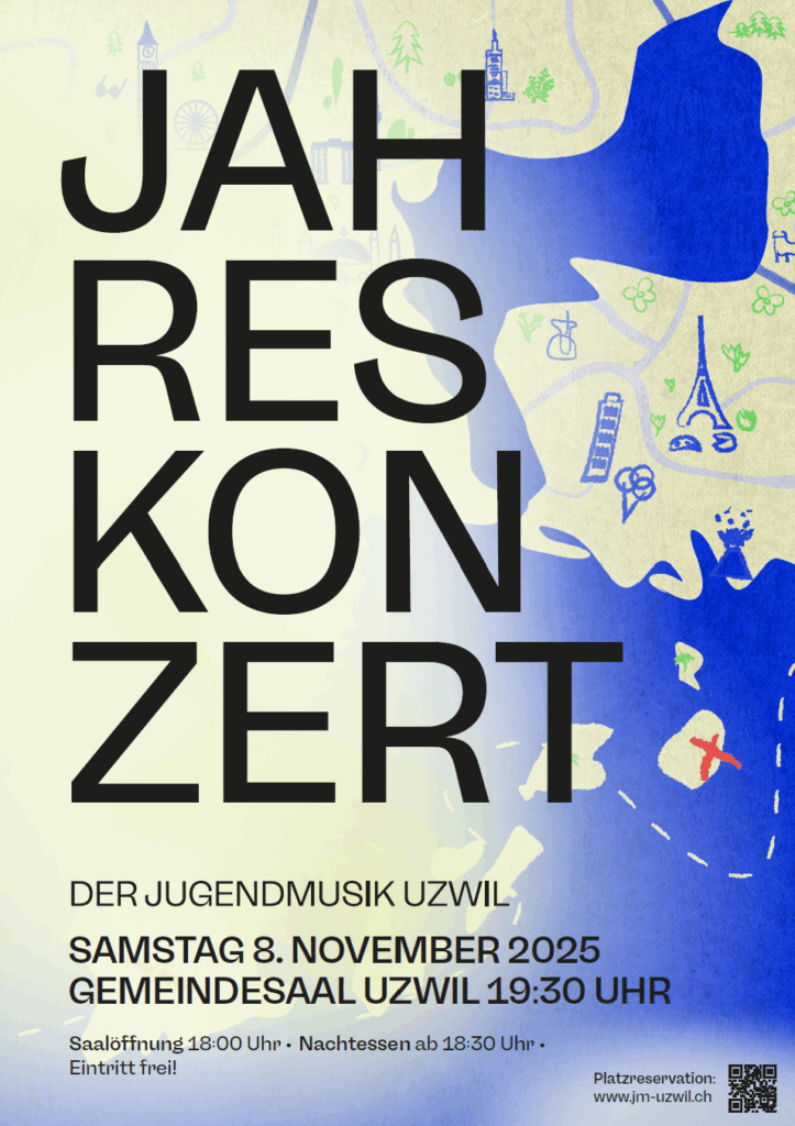 Nach unserer unvergesslichen Reise nach Irland hat die Jugendmusik Uzwil endgültig das Reisefieber gepackt! Und weil Musik die wohl schönste Art ist, die Welt zu entdecken, laden wir euch herzlich zu unserem Jahreskonzert am 8. November ein. Gemeinsam nehmen wir euch mit auf eine klangvolle Expedition rund um den Globus, voller Überraschungen, Emotionen und unvergesslicher Melodien.